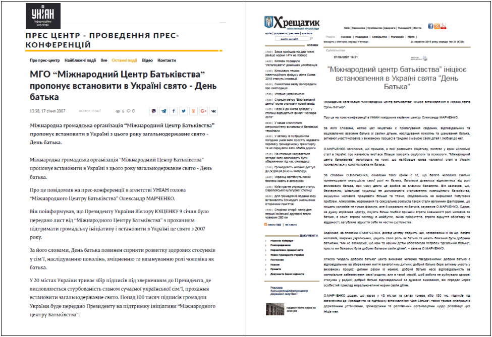 Президент “Міжнародного Центру Батьківства” Олександр Марченко під час прес-конференції в УНІАН офіційного проголосив мету Громадської ініціативи, яка полягає в офіційному відзначенні в Україні "Дня батька".
